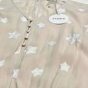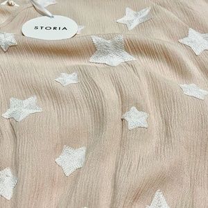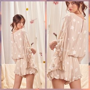 Luxury boutique brand v-neck romper Dolman (Or batwing) sleeves Ruffled trim down the sleeves and shorts Lined shorts Front button closure Keyhole back w/button closure Embroidered star patches all over Elasticized waistband *Color best reflected in sellers pics **See pics for measurements 📌Condition: New 📌Search KGSouthBeach for more items 📌Summer Casual Vacation Beach Pool Party Dressy Flirty Romantic Neutral Beige Tan Cream Ivory White Cute Roomy Oversized Boho B-15 SSPR 737 YABE KSG