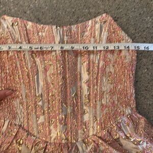 This stunning dress features a gorgeous pink, champagne, and gold jacquard fabric, a corset-style bodice with structured boning, a strapless neckline, babydoll silhouette, and a stretchy smocked back