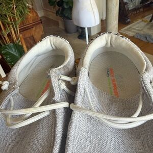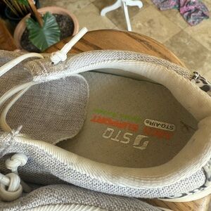STQ Lady slip on shoe lace tie very good condition gray very lightweight great for summer. Cute with shorts or jeans good looking little walk around shoe and very good condition. Leopard print pattern at heel. ARCHSUPPORT machine washable STQ. AIR excellent condition very very clean. Look brand new.