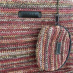 STRADA colorful boho woven shoulder bag with small change purse. Faux leather straps, inside there are two sections with two zip pockets, magnetic snap closure. Small zippered attached coin purse. 100% recycled plastic. Approximate measurements are width 13”, height 11”. Perfect condition.