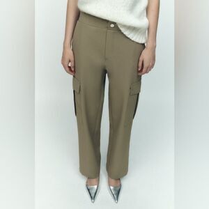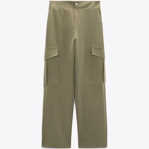 High-waist straight-leg trousers with elasticated waistband at the back. Front pockets and side patch pockets.