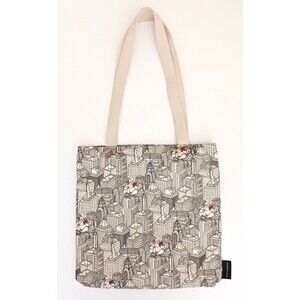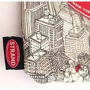 The Strand Bookstore NYC Canvas Tote Bag features a square shape with a medium size of 13x13 inches. Made in the USA with cotton canvas exterior and lining, this unisex tote bag is perfect for carrying books and everyday essentials. The graphic of King Kong reading books on the NYC skyline and literary themes make it a stylish accessory for anyone who loves literature and New York City. The open top closure and double handles in beige cotton add a touch of comfort and convenience to this lightweight and practical tote bag, inside is a deep side pocket with a hook n loop closure. Pre owned, clean, no stains or wear, looks great.