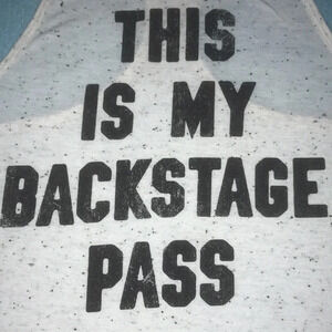 STRANDED This is my backstage pass hi low flowy muscle tank top white with black speckles black writing, semi sheer.