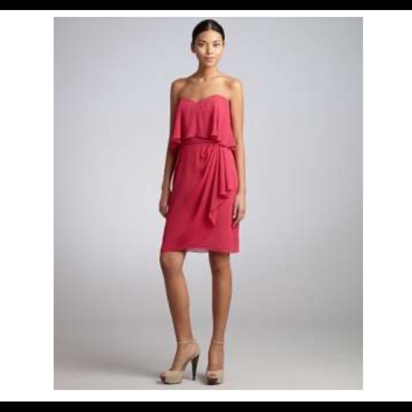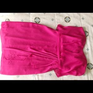 This is a fuschia colored strapless dress, fully lined, nonslip full bodice support. Please take note that there are some light snags near the hem, but no severe damage.