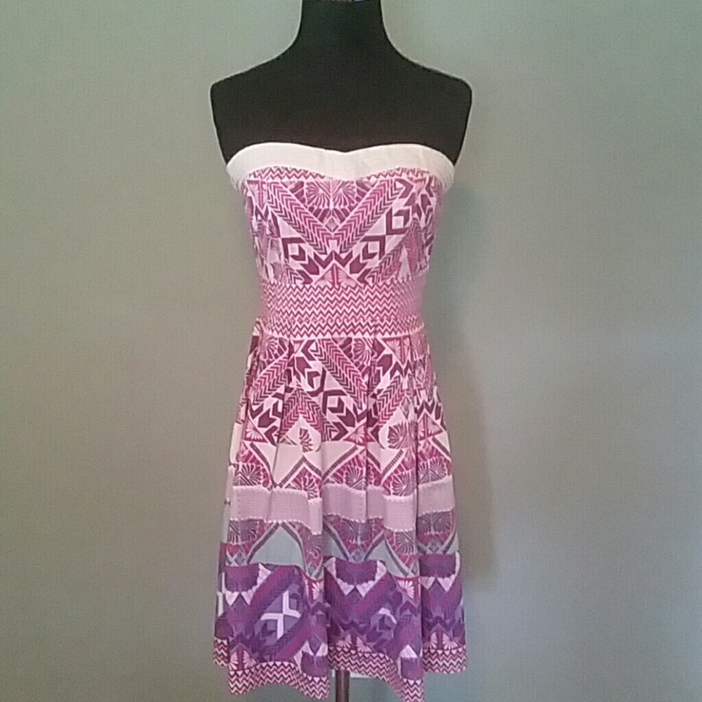 Strapless dress by Angie. Cream colored background with printed design of purple and pink. Gorgeous dress. Worn just a few times
