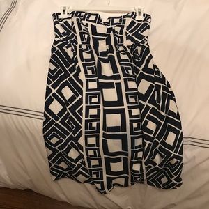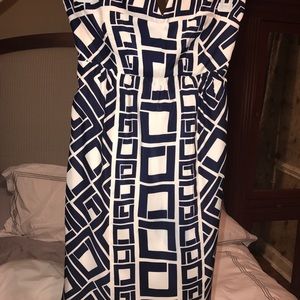 It's a navy and white strapless dress. I've only ever worn it once and had it dry cleaned since. It is in perfect condition. Looks very flattering on.