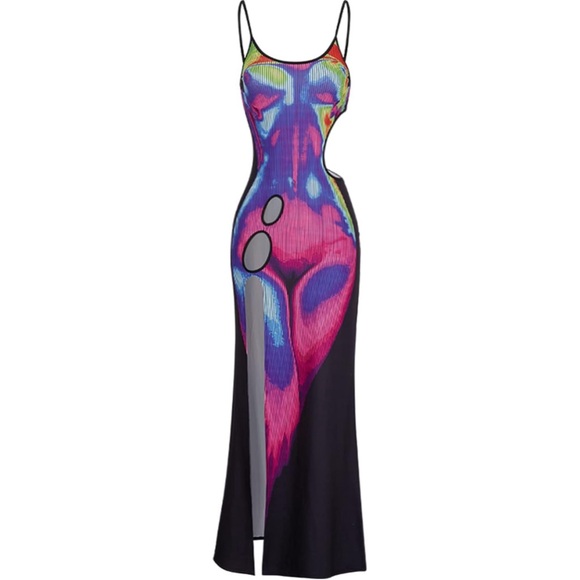 3D Body Print Pattern,Hollow Out Design,Spaghetti Strap,Sleeveless,Crew Neck,Maxi Ankle Length.