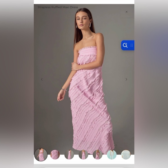 Elegant pink strapless maxi dress with ruffled detailing. Perfect for special occasions.
