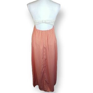 STRAPLESS MAXI DRESS CORAL & CREAM SZ. S/M EUC. GORGEOUS DRESS IN EXCELLENT USED CONDITION.