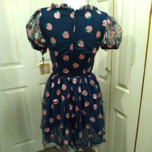This Woodstock Flare dress from Smak Parlour is berry charming, indeed! It features a lovely black tulle that shimmers with red glitter strawberries printed throughout the flirtatious silhouette. The sweetheart neckline is centered by a pull tie embellishment and is framed by charming short puff sleeves. The pointed and seamed waistline tops the playful flare skirt while a back zipper cinches your form.