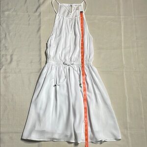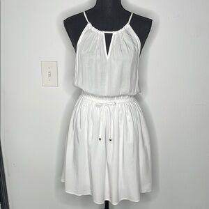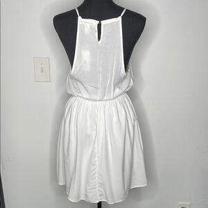 NEW WITH TAGS. This elegant white halter dress is perfect for any occasion. Its sleek design offers a sophisticated look. Has a button clasp at the back,has an elastic waist band with drawstring, and has a little stain at the back.