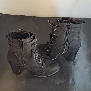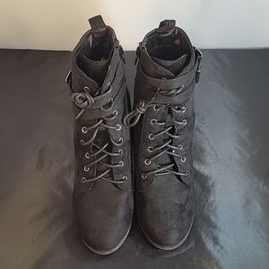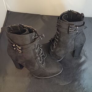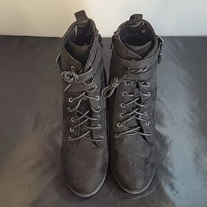 STREETWEAR SOCIETY LACE UP MOE TOE FAUX SUEDE LEATHER ANKLE BOOTIES SIZE 7 COLOR BLACK WITH ADJUSTABLE BUCKLE STRAP WITH UPPER SYNTHETIC SOLE SYNTHETIC MATERIALS HEEL HEIGHT MEASUREMENTS APPROX 4"INCHED THIS ITEMS IS PRE-OWNED EXCELLENT CONDITION WITH ONLY LIGHT SIGNS OF WEAR IF ANY CHECK THE PICTURES