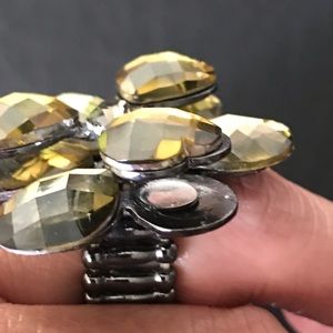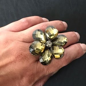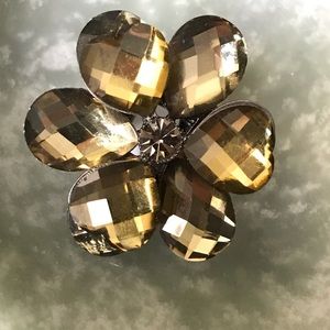 Cute stretch fit flower ring. Amber faceted stones. Rhinestone in center. Beads. Has a stretch fit to accommodate most.