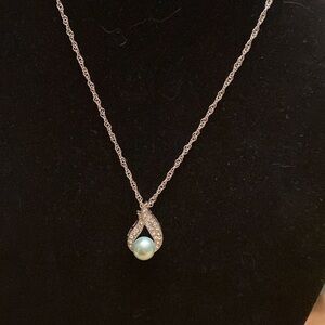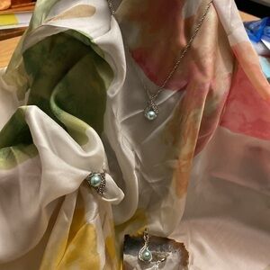 Antique look faux greenish blue pearl surrounded by diamondnic stones set in SS over steel. Necklace and earrings offered in this listing. Ring is available in size 8 - see separate listing or just ask me.