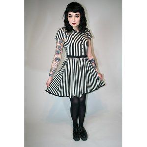 We couldn't wait to share the Lydia dress in cream and black stripes with you! This style is giving us total Victorian-lady-meets-Beetlejuice vibes. It has our signature spiderweb embroidery on the collar, and is fully lined with a soft, shiny knit. It has flutter sleeves, a side invisible zipper, and pockets!
