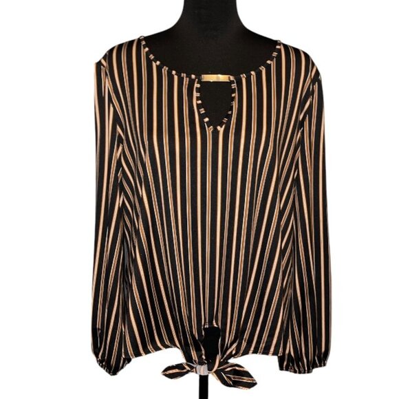 Striped long-sleeve tie-front blouse. It features a keyhole neckline with a gold-tone detail and long sleeves with elasticated cuffs.