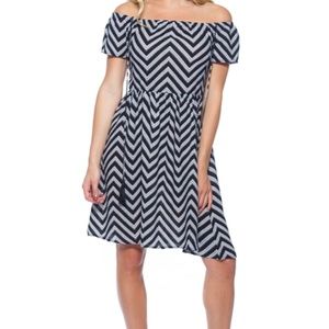 Zig Zag striped BOHO style off the shoulder midi dress. Black and white color.