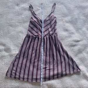 Striped Burgundy Dress. Knee length. Adjustable straps (set to the lowest/longest length for the photo). Great to layer up in the fall! Could be styled with a black belt, leather jacket, tights, and combat boots for a cute fall look.