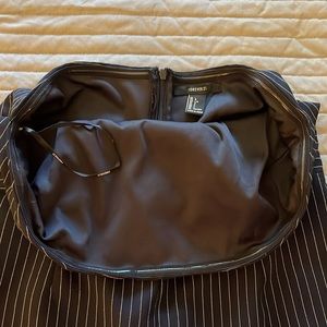 This is a cute Forever 21 strapless romper jumpsuit dark navy blue with white pin stripes size L and made of polyester. rubber lining the top to minimize slipping down, tight top with loose bottom