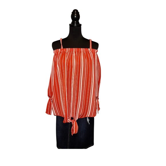 STRIPED SUMMER TOP Stripe Print Off Shoulder Bardot Top. The top features a stripe pattern along with a cold-shoulder, off-the-shoulder design. Elasticated neckline and straps for support, along with 3/4 tie flowing sleeves with tie at hem.