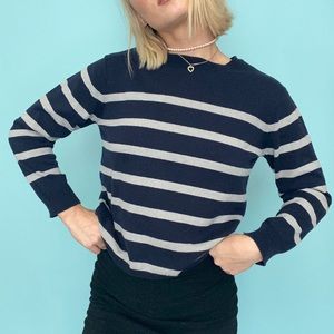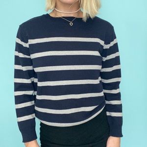 Super cute striped sweater! Navy blue and gray with elbow pads on the back! Size small. Model is 5’2 with a 24” waist.