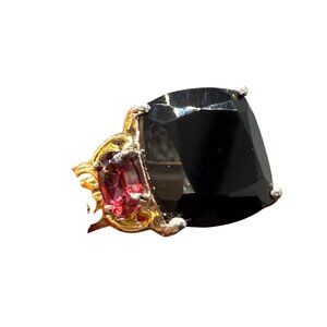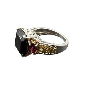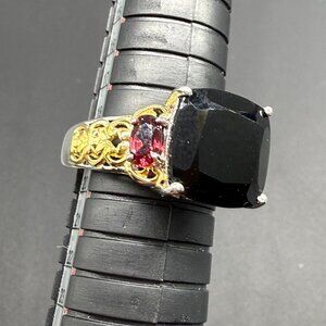 STS 925 Sterling Silver Black Stone Garnet Filigree Cocktail Ring SZ 9 Gold Tone