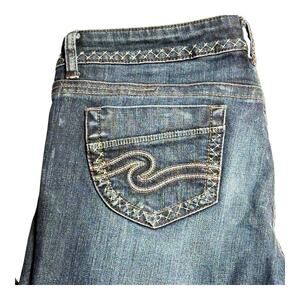 STS Blue Denim JEANS Junior Women Sz 13 (32) Embroidered Waist & Pockets Bootcut