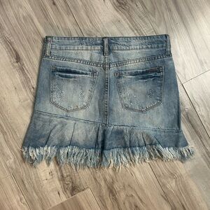 • Style: Distressed denim mini skirt with pleated frayed hem