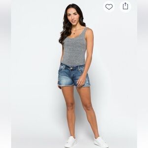 Trendy distressed jean shorts. Perfect for casual wear. Classic blue hue.
