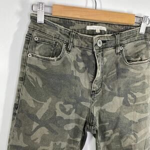 Green camo print Ellie high rise skinny jeans. Button closure, belt loops, skinny legs.