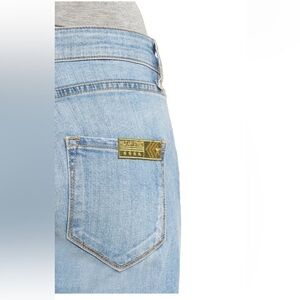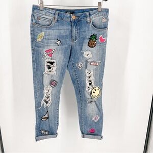 Colorful embroidered badges add retro-cool edge to shredded, light blue denim jeans with a skinny but slouchy fit and frayed cuffs.