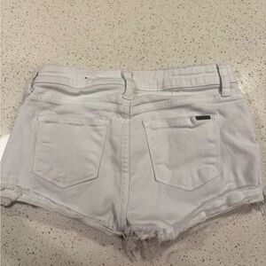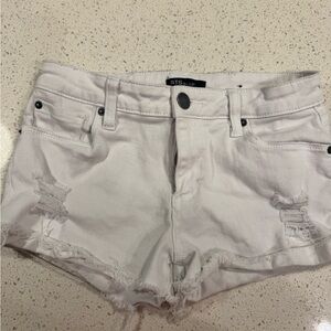 Chic white jean shorts with distressed details. Ideal for casual outings.