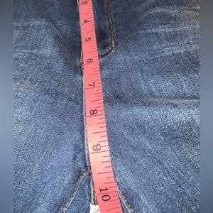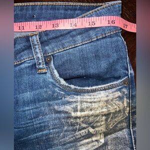 5 pocket design. Raw hem, stair step stylish design. Silver accents on front of jean.