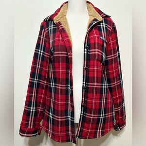 It’s like a flannel shirt exterior with a cozy Sherpa interior. Perfect for cool mornings and nights.
