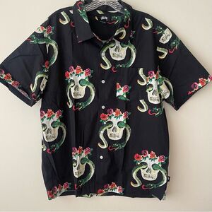 STÜSSY Men Button Down Shirt Skull Pattern in Black size large