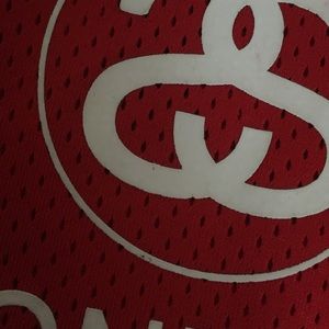 STÜSSY RED MESH LOGO JERSEY // size S/Small !! I thrifted this so there‘s a minor flaw, but other than that this item is in really good condition! there’s no cracking on the letters or anything :)