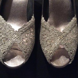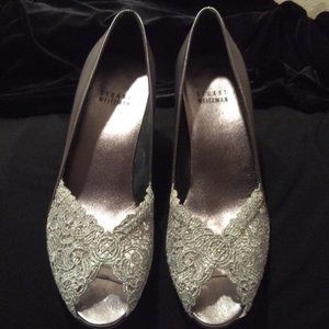 Stun the party people in these=STUART WEITZMAN elegant 'Chantelle' design peep-toe formal pumps with a beautiful romantic design=Silver leather with tiny Swarovski crystal accents on the front lace vamp-perfect to wear for bridal events! Comfortable 2.5' heel. Made in Spain. Excellent barely used condition. Size 6 1/2