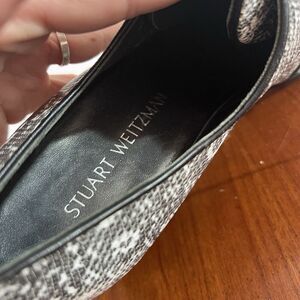 Elevate your footwear game with these Stuart Weitzman pointed toe pumps, boasting a bold animal print that's sure to turn heads. These chic shoes feature a classic black colorway, complemented by an eye-catching high block heel that provides both style and comfort. Crafted for the fashion-forward woman, these size 9.5 heels lace up for a secure fit and are designed with a versatile pump style that transitions effortlessly from day to night. Whether you're dressing up for a special occasion or adding an artistic touch to your everyday ensemble, these shoes bring a touch of designer flair to any outfit.
