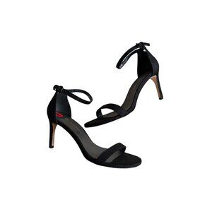 Elevate your style with these chic Stuart Weitzman black leather ankle strap sandals. Perfect for any occasion, these heels offer a timeless design and effortless sophistication. New without box, they promise comfort and elegance.