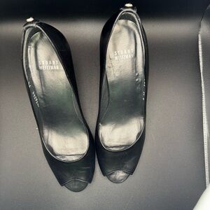 Keywords: Stuart Weitzman, black heels, leather wedges, peep toe, wedge shoes, women's fashion, dress shoes, elegant, classic, sophisticated, business casual, special occasion, evening wear