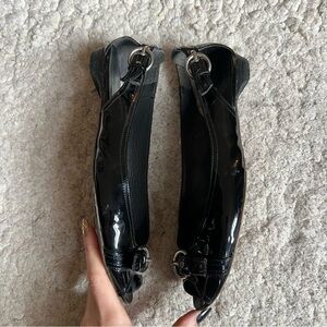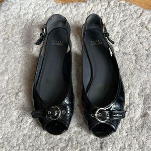 STUART WEITZMAN: Black Patent Leather Silver Buckle Detail Cutout Accent Ballet Flats