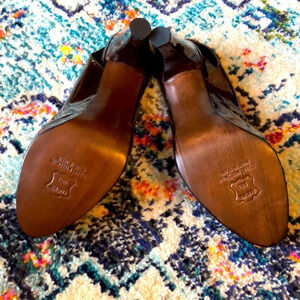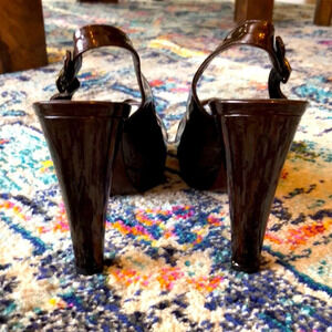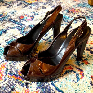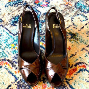 STUART WEITZMAN Brown Patent Leather Slingback Crisscross Peep Toe Heels