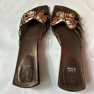 Step into a piece of fashion history with these absolutely stunning vintage Stuart Weitzman butterfly sandals. A true treasure for any fashion enthusiast, this pair is in great pre-owned condition with some normal wear, which is to be expected for a loved vintage item. The intricate beaded butterflies and rich bronze-brown hue make these sandals a rare and enchanting find. Please examine the photos closely to see the detailed condition of the shoes.