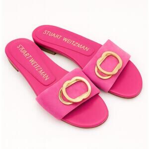 Add a touch of luxury and playfulness to your look with these Stuart Weitzman Caicos Slide Sandals — a statement piece that blends vibrant color, elegant design, and quiet luxury craftsmanship. Crafted from plush pink suede, these sandals feature a sculptural gold buckle detail and smooth leather footbed for a chic yet comfortable fit. The modern minimalist silhouette makes them the perfect finishing touch to both resort-ready looks and city chic outfits.