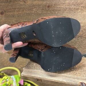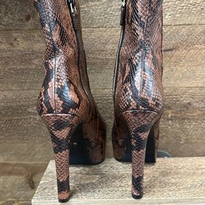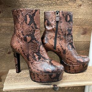 Fierce and fashion-forward Stuart Weitzman high heel platform ankle boots in a striking brown and black snake print. Crafted in Spain with a bold silhouette and luxe finish—these boots are perfect for adding edge to your wardrobe.