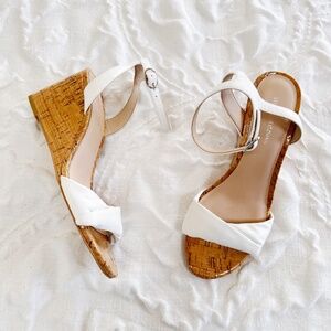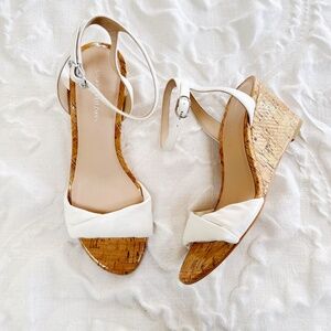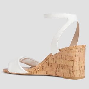 An asymmetric top strap creates visual intrigue on a leather sandal lifted by a cork-wrapped wedge heel.