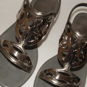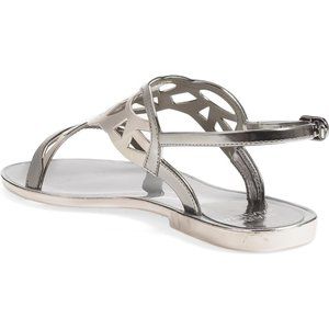 A summer-favorite jelly sandal is all grown up in a molten metallic finish & Intricately cut latticed geometric cutouts. Open toe. An adjustable sling-back strap features a hidden elastic inset to move with your foot, and the synthetic foot-bed softens with the heat of your foot for a comfortable fit.