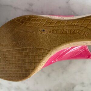 This shoe features a bright pink patent leather upper with a peep toe design and a slingback strap, along with a cork wedge heel. Stuart Weitzman is a luxury footwear brand known for its quality craftsmanship. The brand offers a variety of styles, including sandals, heels, and boots. The company was founded in 1986 and is based in New York City. The brand is popular among celebrities and has been worn at events like the Met Gala. Stuart Weitzman sandals will bring you the right amount of style and gloss.