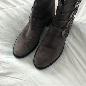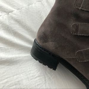Pre-loved STUART WEITZMAN Jitterbug multi buckle Boot. Color is hard to describe but accurate in pictures. They are a gray / brown or as SW calls it “Seal”. Size 8 but will also fit 7.5 comfortably - they run small IMO. Good - preloved condition. Signs of wear. Detailed pics of both boots in high sharpness. Majority of marks are on the interior side of the boot, the buckle sides are in near perfect condition. Soles in great condition. Can be shipped in original box with dust bag.