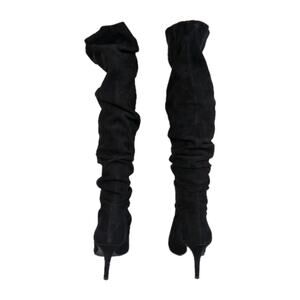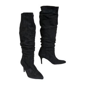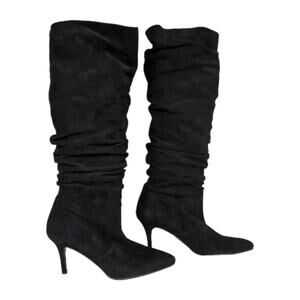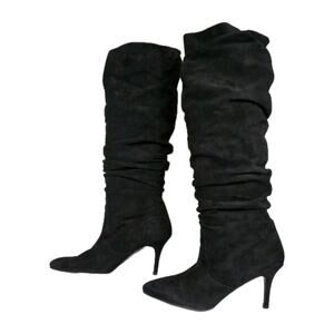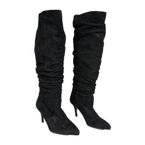 Black suede leather Lafayette slouchy pointed toe knee high boot by Stuart Weitzman. MSRP $700